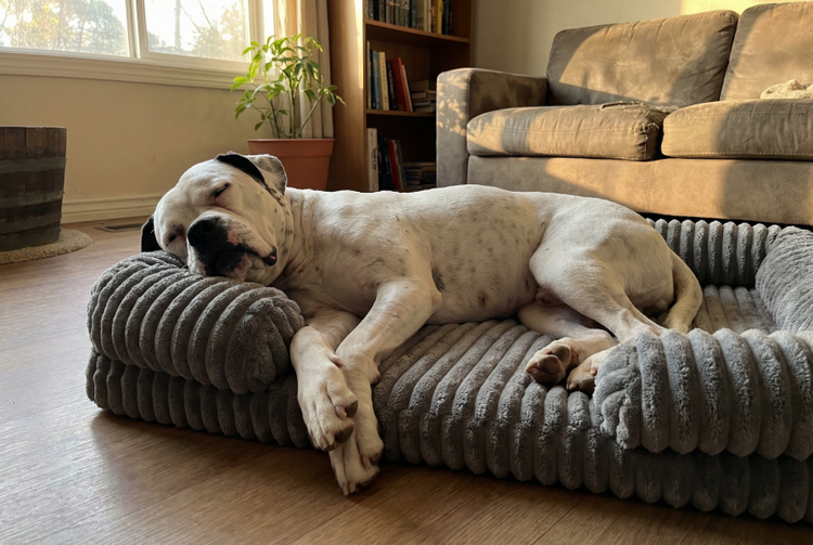 Mon Boxer commence à être raide au réveil, donc je cherchais un lit orthopédique sérieux. Il se relève plus facilement et semble beaucoup plus à l’aise. On voit qu’il dort plus profondément.